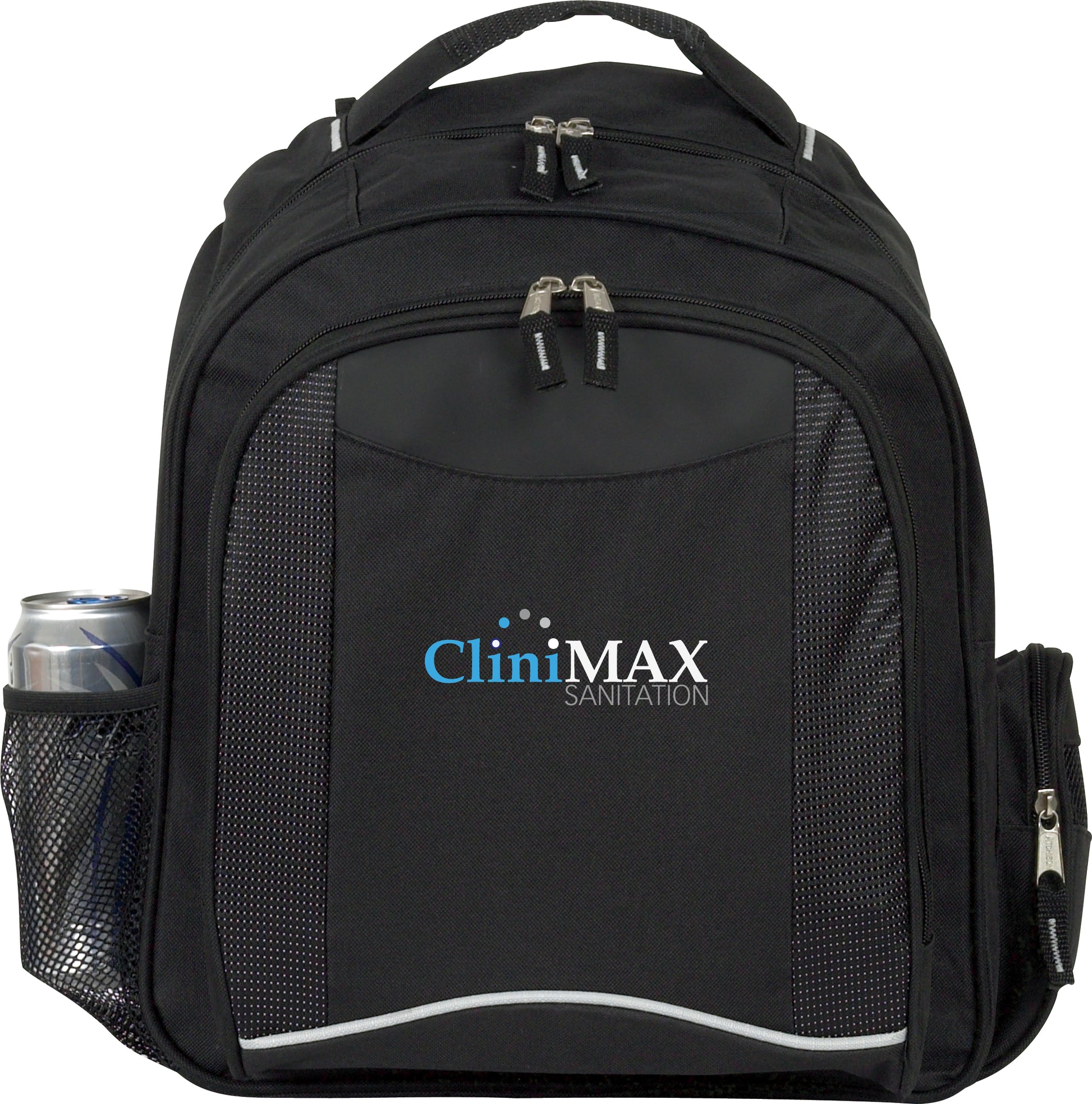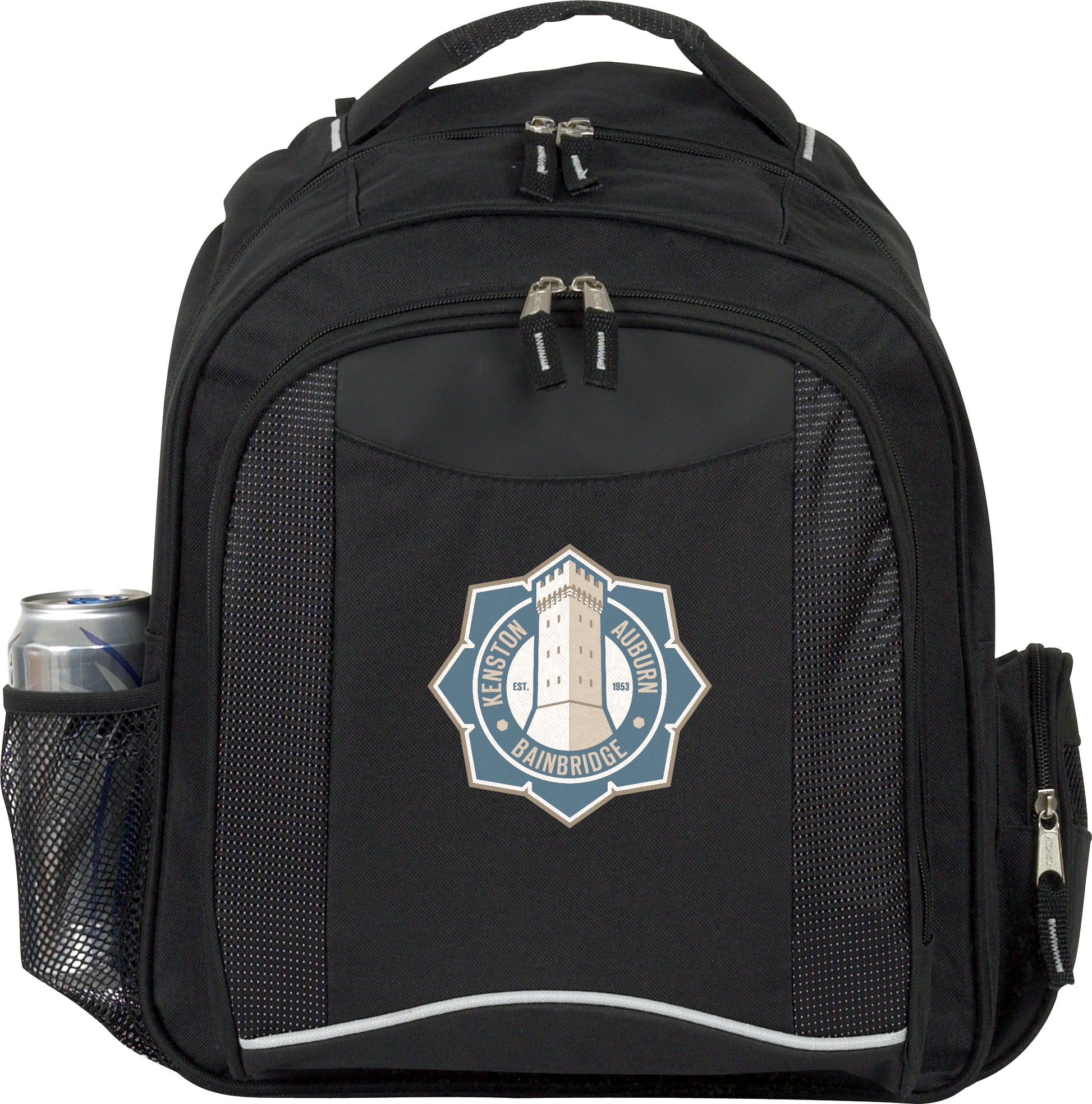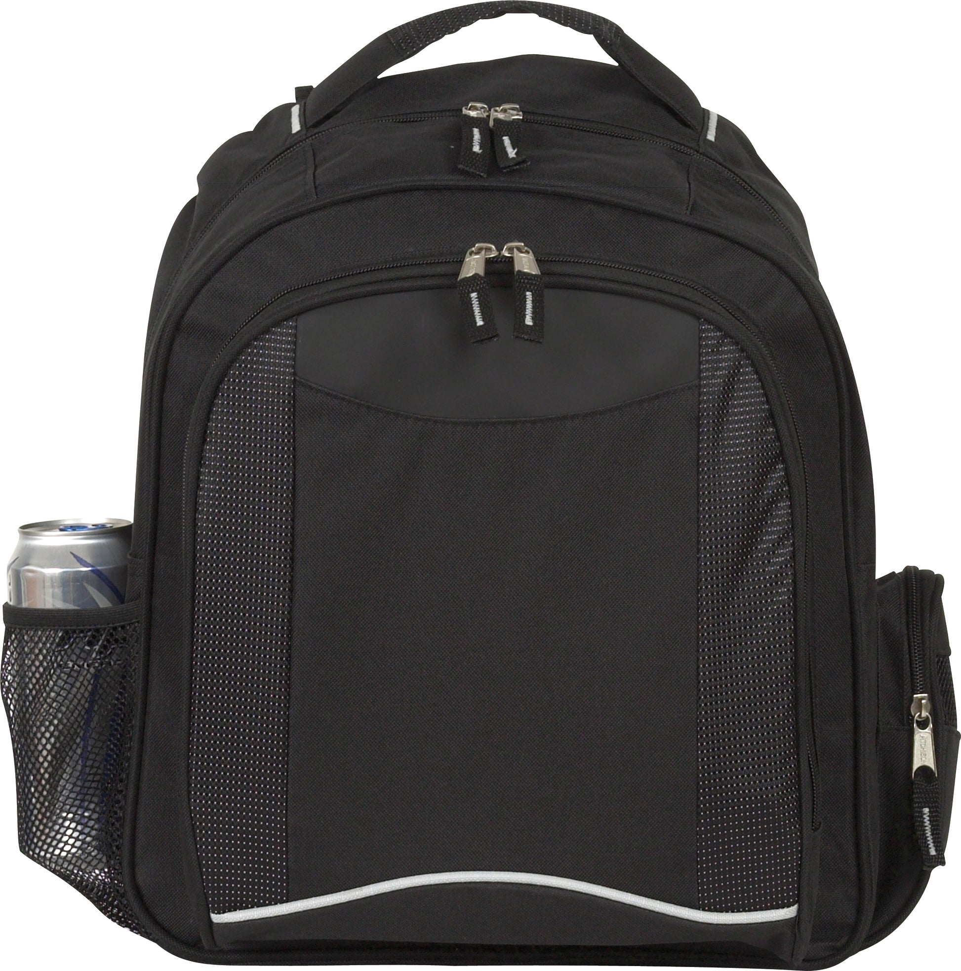 This backpack fits a lot of features into a compact size It boasts a mesh water bottle pocket a zippered main compartment a zippered front pocket with organizer panel and a fully padded back and laptop compartment