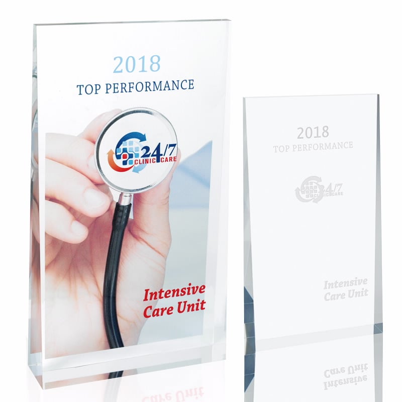 This freestanding acrylic wedge award has a classic yet modern look to it