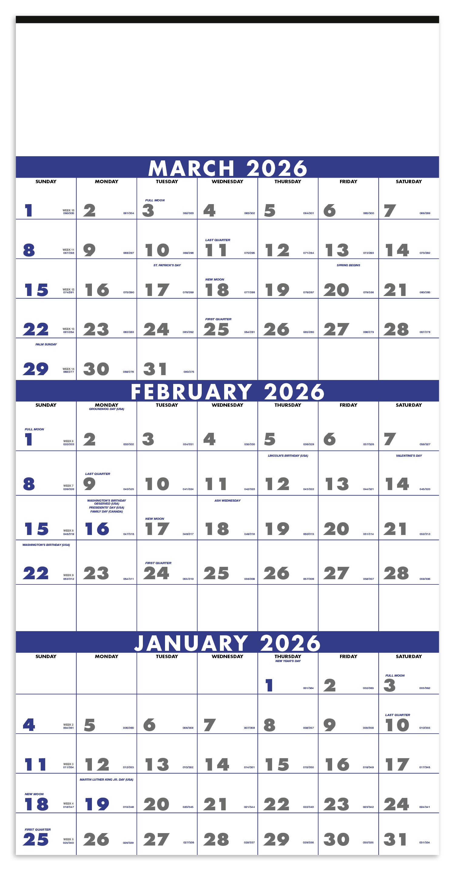 Showing three months at once this calendar is easytoread and useful Simply tear off the old month at the perforation and a new one appears The SFI label means that materials used for this product have been responsibly sourced